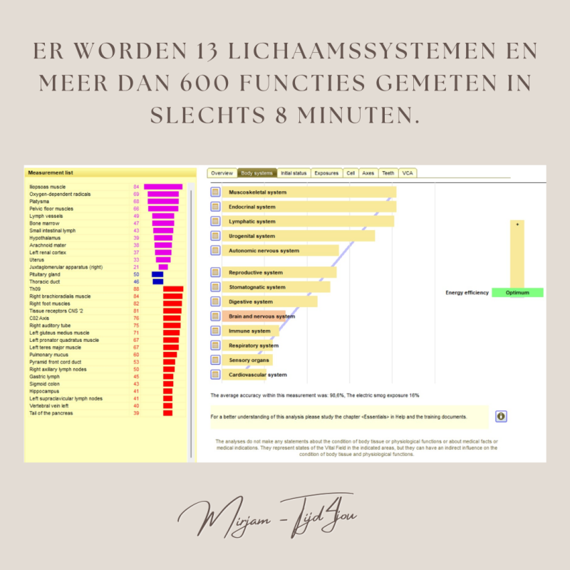De scan laat zien welke uitdagingen jouw lichaam tegenkomt om gezond en in balans te blijven. Je lichaam heeft een complexe taak: het moet organen, weefsels en cellen vitaal houden, beschermen tegen virussen, bacteriën en ziekten, afvalstoffen verwerken, én omgaan met natuurlijke verouderingsprocessen. Wanneer één van deze processen niet optimaal verloopt, kan dit je welzijn verstoren. Het herstellen van het natuurlijke evenwicht in je lichaam is dan essentieel om weer balans en energie te kunnen ervaren.